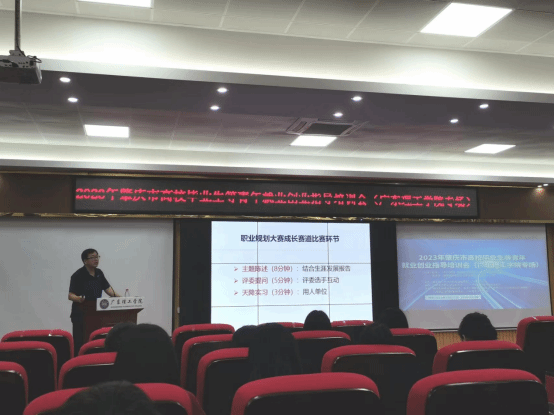 启动仪式后,广东外语外贸大学南国商公司经理吴晓义教授为在场师生做了首届全国老员工职业规划大赛的辅导。他结合以往的办赛经验,对本次职业规划大赛成长赛道和就业赛道的参赛材料、评审标准、比赛环节等进行了详细的阐述,并与现场的师生分享了往届比赛获得一等奖的优秀案例,引导大家思考如何结合平时学习准备职业规划大赛,如何巧妙把握自身优势与劣势,如何在劣势之中凭借睿智进行转化。