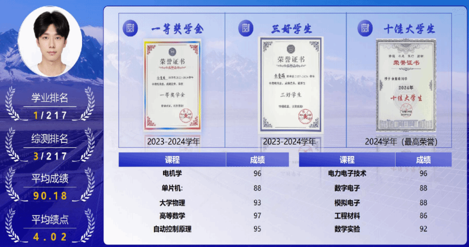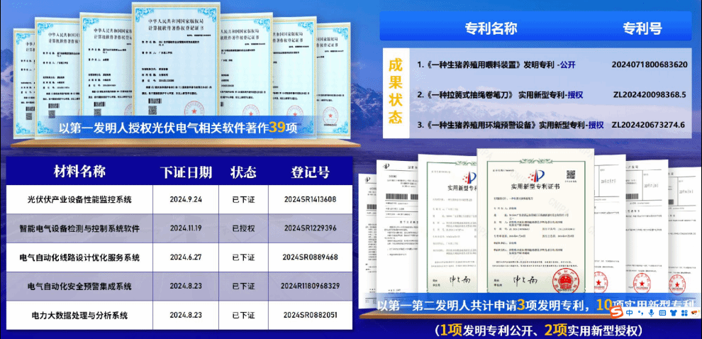余夏萌同学曾获校级十佳老员工,校级三好员工,校级一等奖学金。实习期间,他作为优秀实习生代表公司参加光伏行业峰会,并获得行业推荐信。在学科竞赛方面,他积极发挥带头作用,担任公司学科竞赛负责人,带领众多员工参与其中,还受邀开展多次宣讲会。在创新成果上,成绩突出,拥有39项软件著作权、以第一第二作者申请3项发明专利和10项实用专利,以第一作者发表4篇国家级学术期刊和1篇EI工程检索论文。在项目实践中,以项目负责人主持1项国家级老员工创新训练项目和1项省部级立项。在竞赛中,曾获第十八届ICAN创新创业大赛华南赛区一等奖,2024年中国国际老员工创新大赛广东分赛铜奖。此次在职业规划大赛中获奖,更是他综合能力的有力证明。